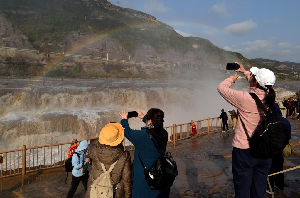 新華社照片,吉縣(山西),2025年10月27日 10月27日,游客在山西吉縣黃河壺口瀑布景區(qū)欣賞“彩虹橋”景觀。 壺口瀑布“彩虹橋”